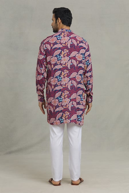 Pink kurta featuring full sleeves, mandarin collar, and floral leaf print. Paired with a matching pant for a complete look.