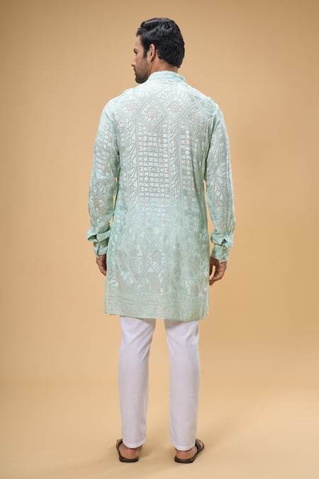 Mint green kurta featuring full sleeves and band collar with Lucknowi mosaic blossom embroidery. Paired with white cotton pants for a complete look.