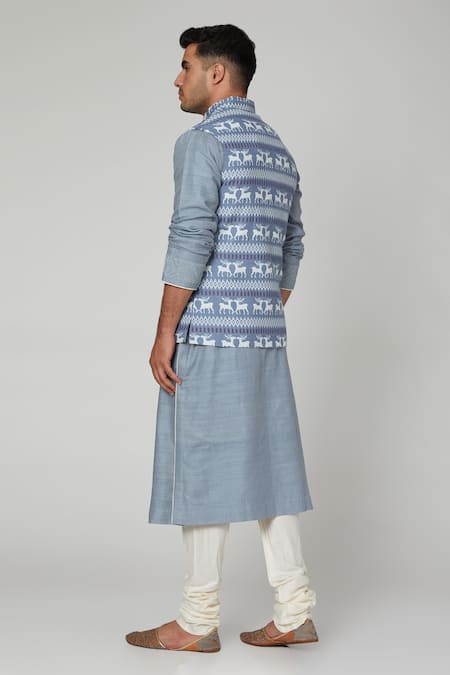 Sky blue washed denim bundi with all over printed detail and welt pockets.