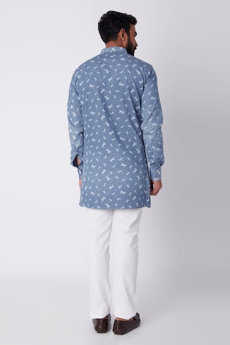 Sky blue washed denim kurta with all over horse printed detail and patch pocket.