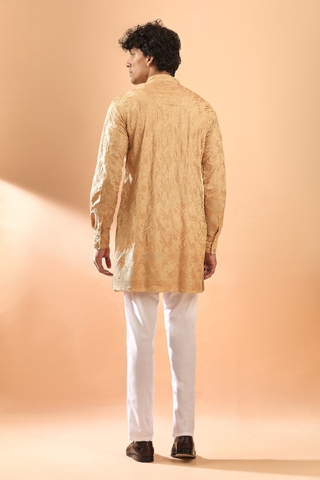 Gold kurta featuring tonal laser cut applique work with a geometric pattern. Paired with off-white cotton satin pants for a complete look.