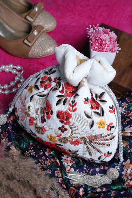 White potli pouch featuring floral and bird hand embroidery in vibrant colors