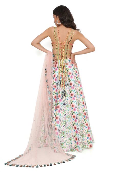 Cream dupion lehenga with spring floral prints. Comes with rose pink georgette embroidered choli and rose pink net mukaish dupatta.