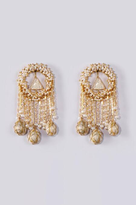 Gold dangler earrings featuring intricate embellishments of beads, pearls, and shell drops