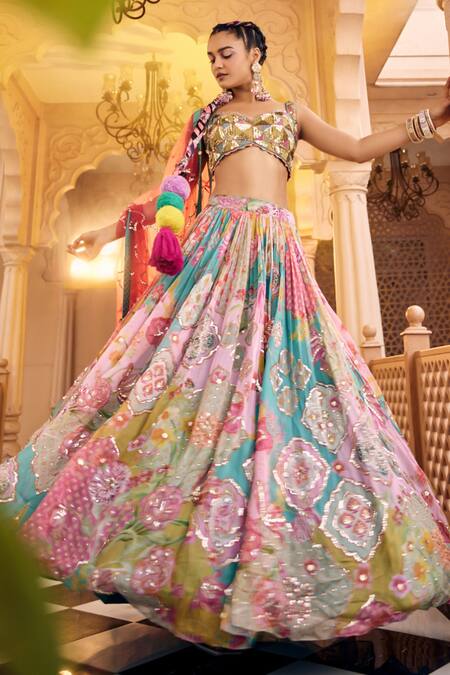 Multi Color Organza, Silk, Net Sequins, Geometric Abstract Print Lehenga Set