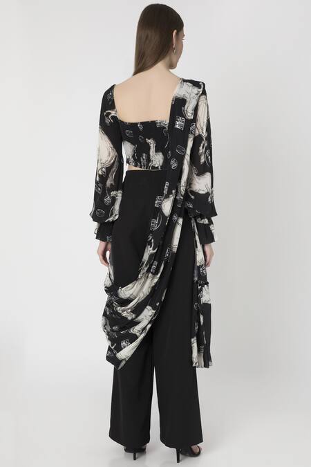 Black pants with attached stallion print drape. Paired with a complementing blouse. This garment comes with a unique eco friendly concept of potli bag attached to the drape.