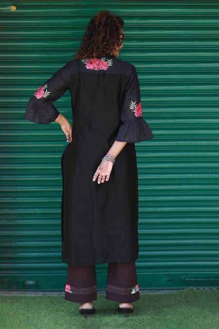 Midnight black circular flounce sleeve straight fit kurta made in chanderi silk base, accentuated with contrast rose bloom print. Paired with a pant.