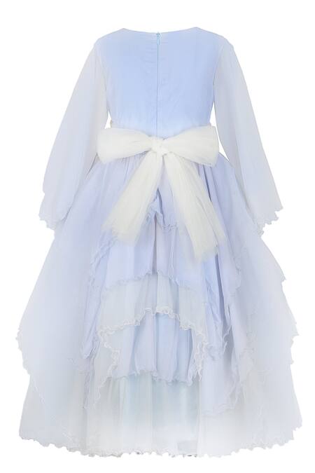 Floral embellishments at the waist, Layered tulle skirt design, Back bow detail