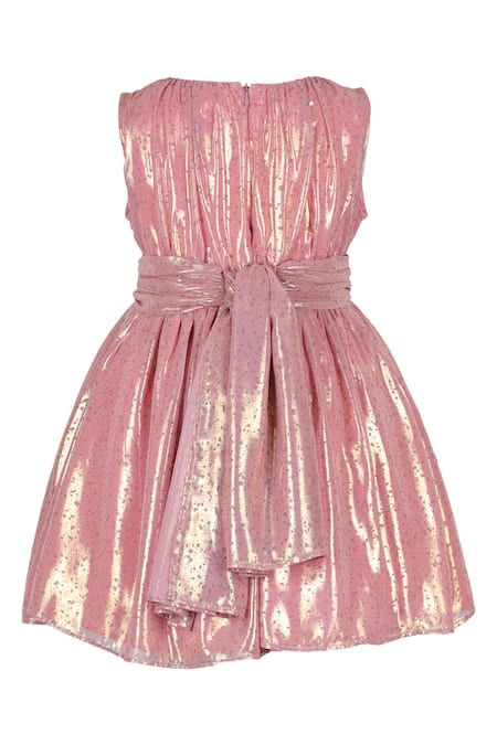 Pink satin dress featuring foil print and floral applique embroidery on the waistband
