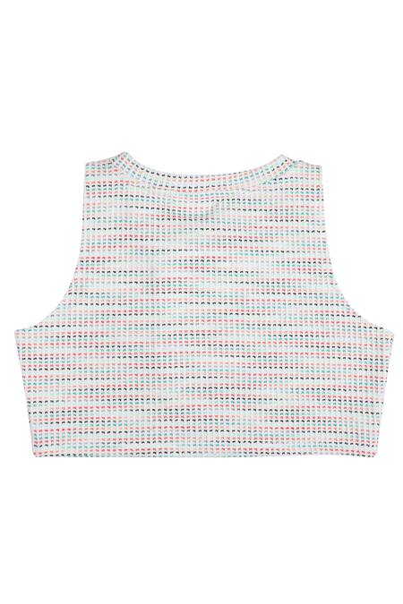 Multi colored cropped top featuring a round neckline and sleeveless design