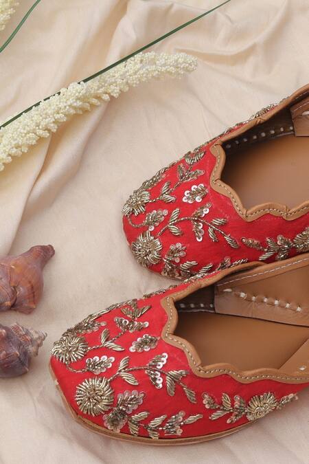 Buy_Stitched Soles_Red Embellished Royal Zardozi Hand Work Juttis_at_Aza_Fashions