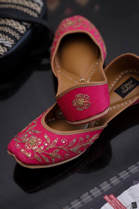 Fuchsia juttis featuring intricate sequins embroidery on raw silk