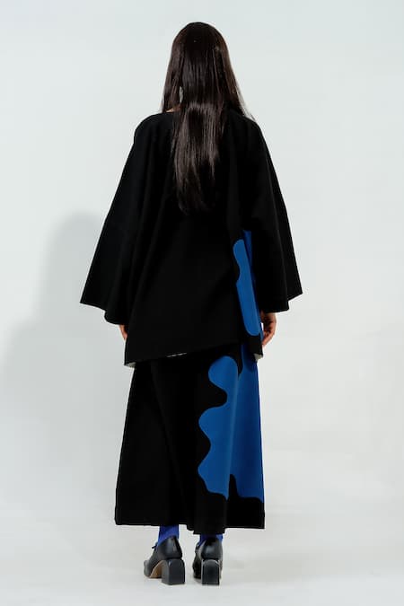 Black top featuring blue applique work on the side and full length kimono sleeves