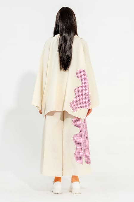 Off white relaxed flared pant featuring pink hand printed polka dot applique work and two cross pockets