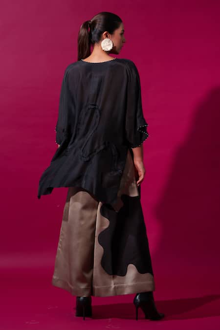 Buy_Stoique_Black Silk Pearls Split V-neck Flamingo Embroidered Asymmetric Kaftan _Online_at_Aza_Fashions