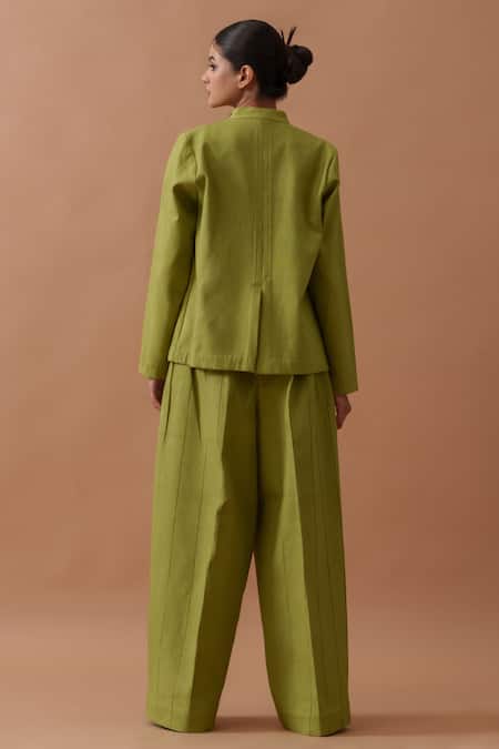 Green bandhgala style jacket featuring an elongated collar in handwoven cotton