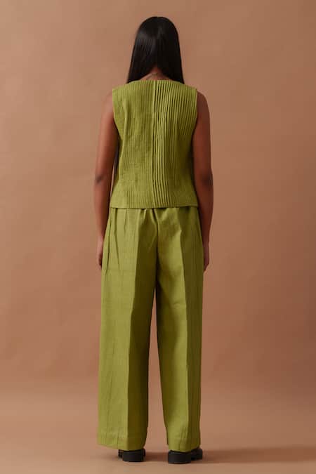 Green Handloom Cotton V-neck Sunflower Pleated Waistcoat