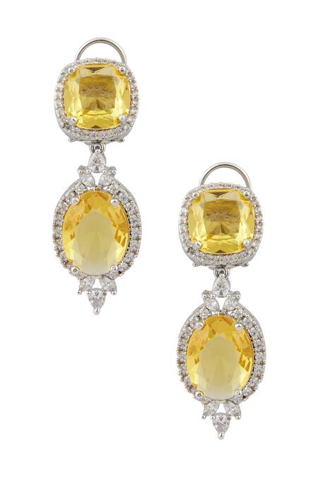 Yellow stone drop earrings featuring rhodium plating and faux diamond embellishments