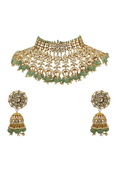 22kt gold plated choker featuring white stones and sea green bead drops. Paired with floral top jhumkas adorned with similar embellishments.