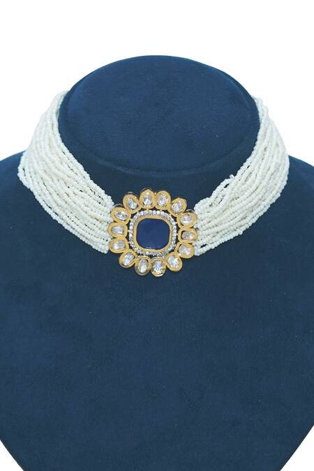 Gold finish choker featuring blue stone embellishment at the center, complemented by multi-shell pearl strands. Paired with matching stud earrings adorned with blue stones.