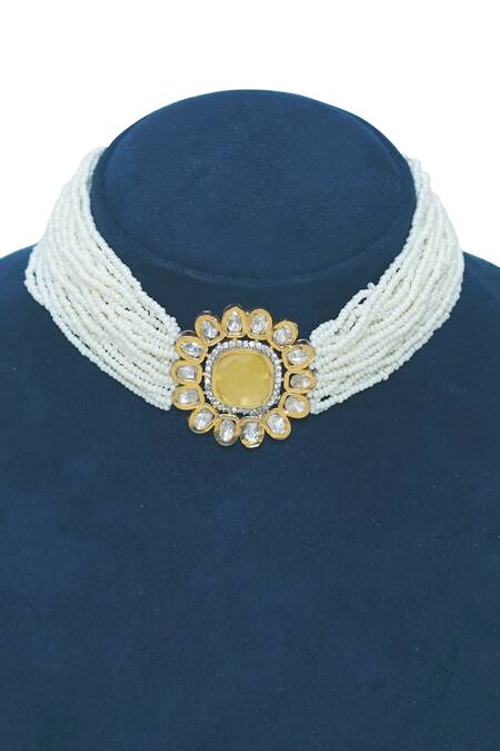 Gold finish choker featuring a yellow stone centerpiece with multi-shell pearl strands. Paired with stud earrings adorned with yellow stones and a push back clasp.