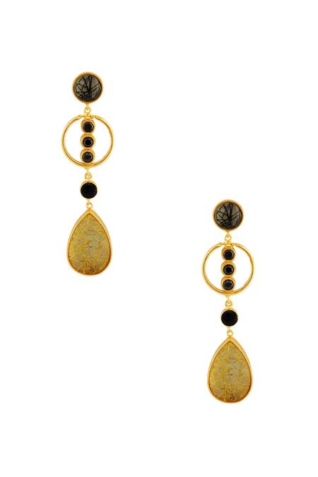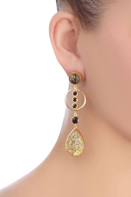 Black drop earrings with a gold highlighted stone in a teardrop shape featuring a gold finished ring.