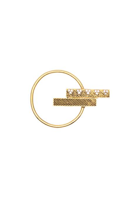 Gold-plated silver adjustable ring in circular design with encrusted stones & carved detail.