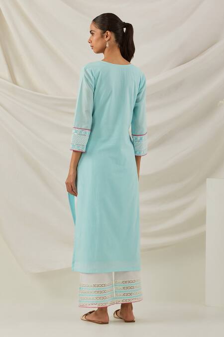 Blue straight kurta featuring placed floral chikankari embroidery on yoke and sleeve borders. Paired with palazzo and a pink contrast lace insert dupatta.