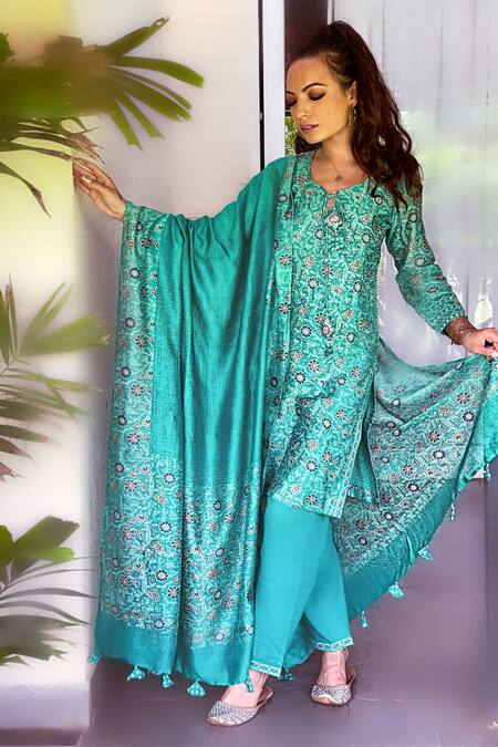 Green floral printed kurta featuring a tie neckline and three-quarter sleeves. Paired with a matching pant and a dupatta adorned with zari borders and diamond embroidery.