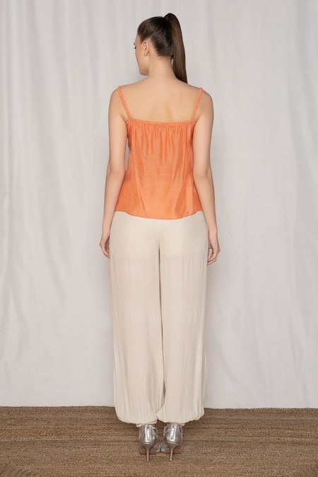 Coral strappy top featuring all-over hand embroidery with ruffle trim on the neckline and sleeves. Paired with solid joggers that have elasticated hems and elastic at the back.