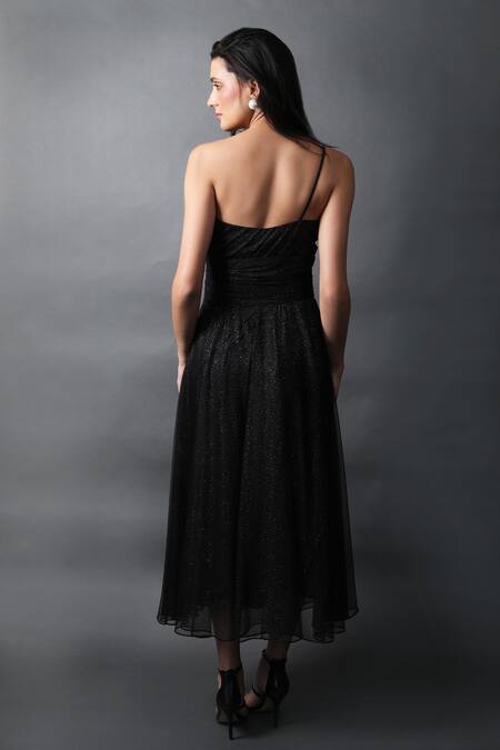 Black flared dress featuring a one-shoulder neckline and a side slit