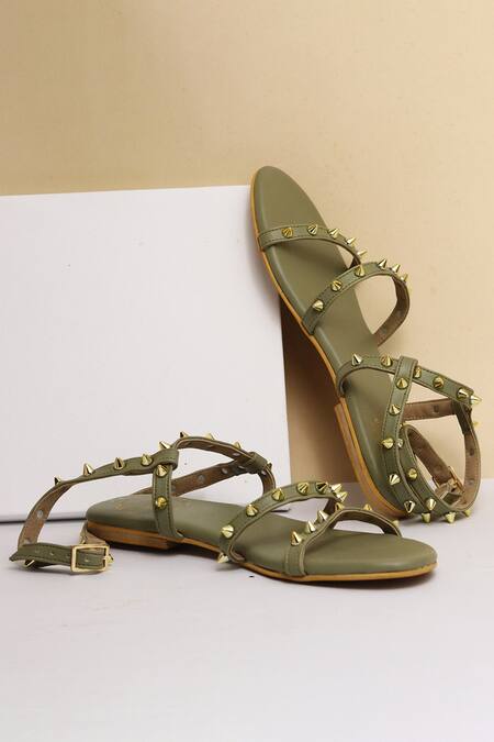 Green sandals with studded straps, open toe & adjustable buckle.