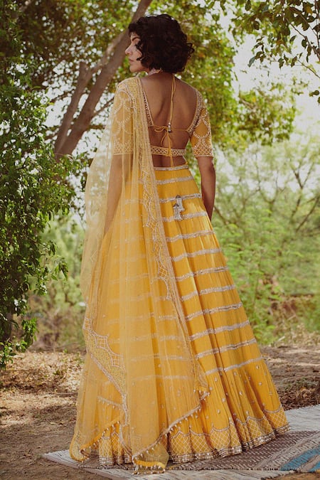 Yellow Net, Georgette Thread Work, Beads V Neck Stripe Embroidered Lehenga Set