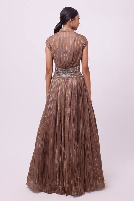 Brown cropped jacket with gold stripe pattern all-over and embroidery on the waistband. Comes with bustier and lehenga.