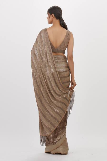 Grey chiffon saree featuring embroidered waistband and sequin work with fringe pallu. Paired with a sleeveless embroidered blouse with plunge V neck.