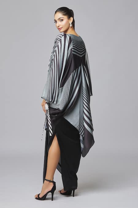 Tie-up balloon sleeves, Asymmetric draped design, Contrast striped pattern