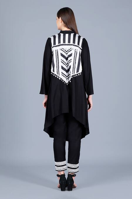 Black two-way tunic with white stripes, rick rack lace detail and coin embellishment.