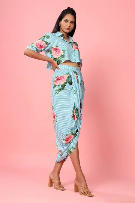 Blue cropped shirt with floral printed motifs and stripes. Comes with co-ordinating lungi style skirt.