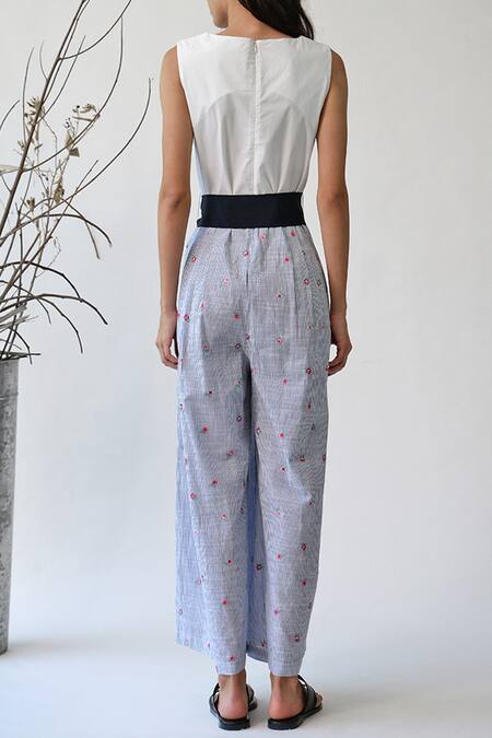 Blue and white striped jumpsuit with floral embroidery. Comes with a tie-up belt.