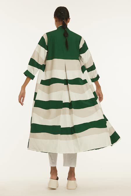Green 100% Cotton Poplin And Bemberg Collared Neck Striped Long Jacket & Kurta Set