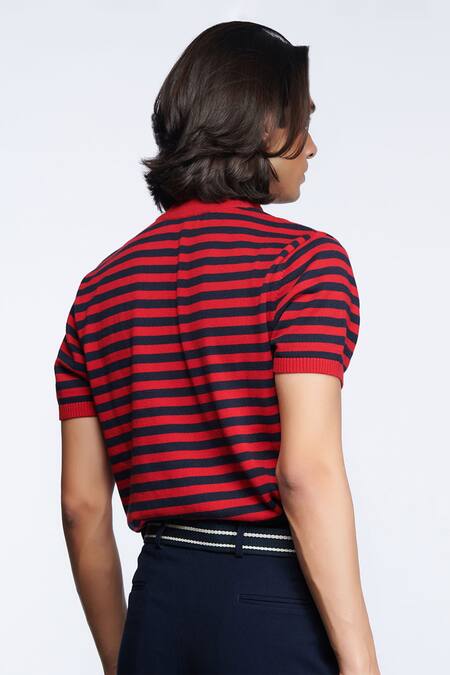 Navy T-shirt in knitted fabric featuring contrast stripe patterns and crest patchwork