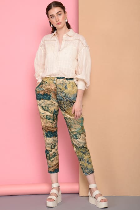 Embroidered, Vertical stripes, Lace trim detail, Bishop sleeves, Note:, Pants worn by the model is not for sale