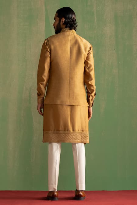 Mustard floral embroidered bundi featuring dori, aari, sequin, and bead work. Paired with a border embroidered pintuck kurta and ivory pant.