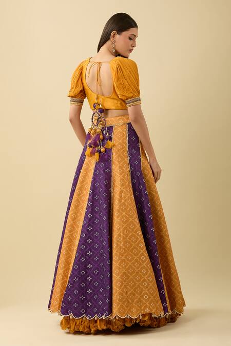 Yellow and purple colorblock panelled lehenga featuring geometric and bandhani prints with frills at the bottom. Paired with a blouse adorned with beads, sequins, and shells embroidery along with an ombre dupatta.