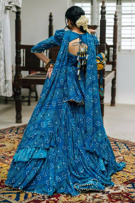 Blue Georgette, Silk Embroidery, Bandhani Print Lehenga And Peplum Kurta Set