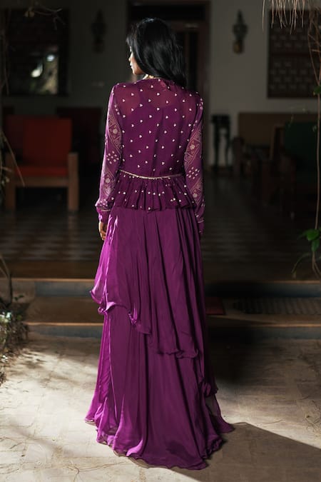 Purple bandhej print peplum jacket featuring a front key-hole opening and embellished with crystal stones. Paired with an inner blouse and an asymmetric layered skirt.
