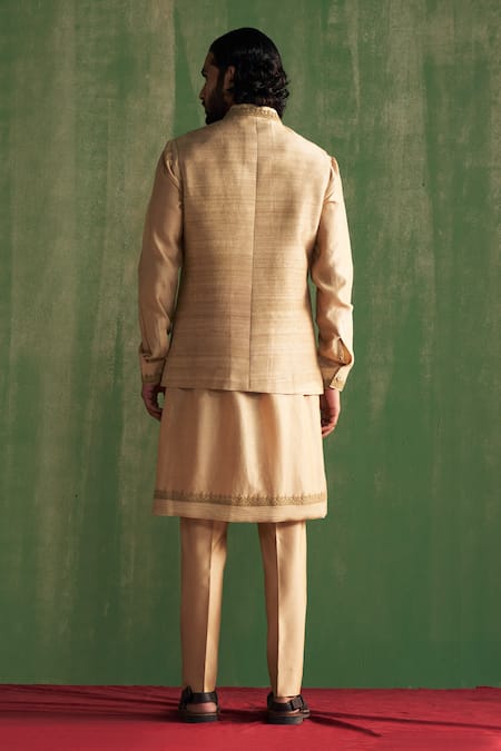 Beige bundi featuring dori and bead placement embroidery on the collar and pocket. Paired with a border embroidered pintuck kurta and matching pant.
