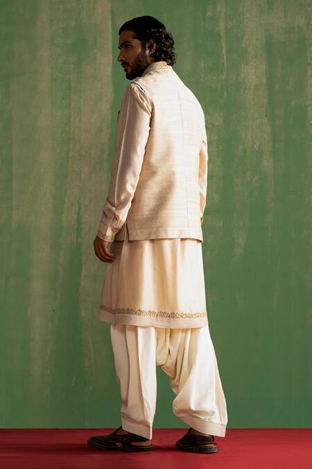 Beige bundi featuring dori and bead placement embroidery on collar & pocket. Paired with a border embroidered pintuck kurta and ivory salwar.