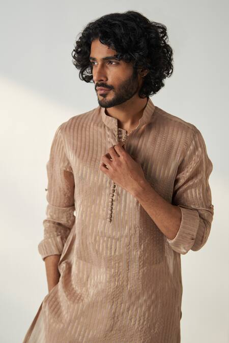 Beige kurta featuring metallic stripe pattern with potli buttons at the front. Paired with straight pant in chanderi fabric.