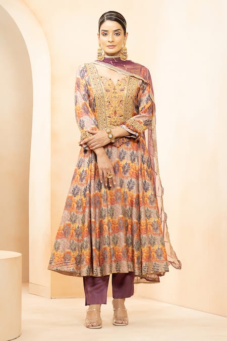 Multi color full sleeves flared padded anarkali featuring all over floral bloom print and floral embroidery on the yoke and cuffs. Paired with a contrasting purple straight pant and gota patti embellished dupatta.